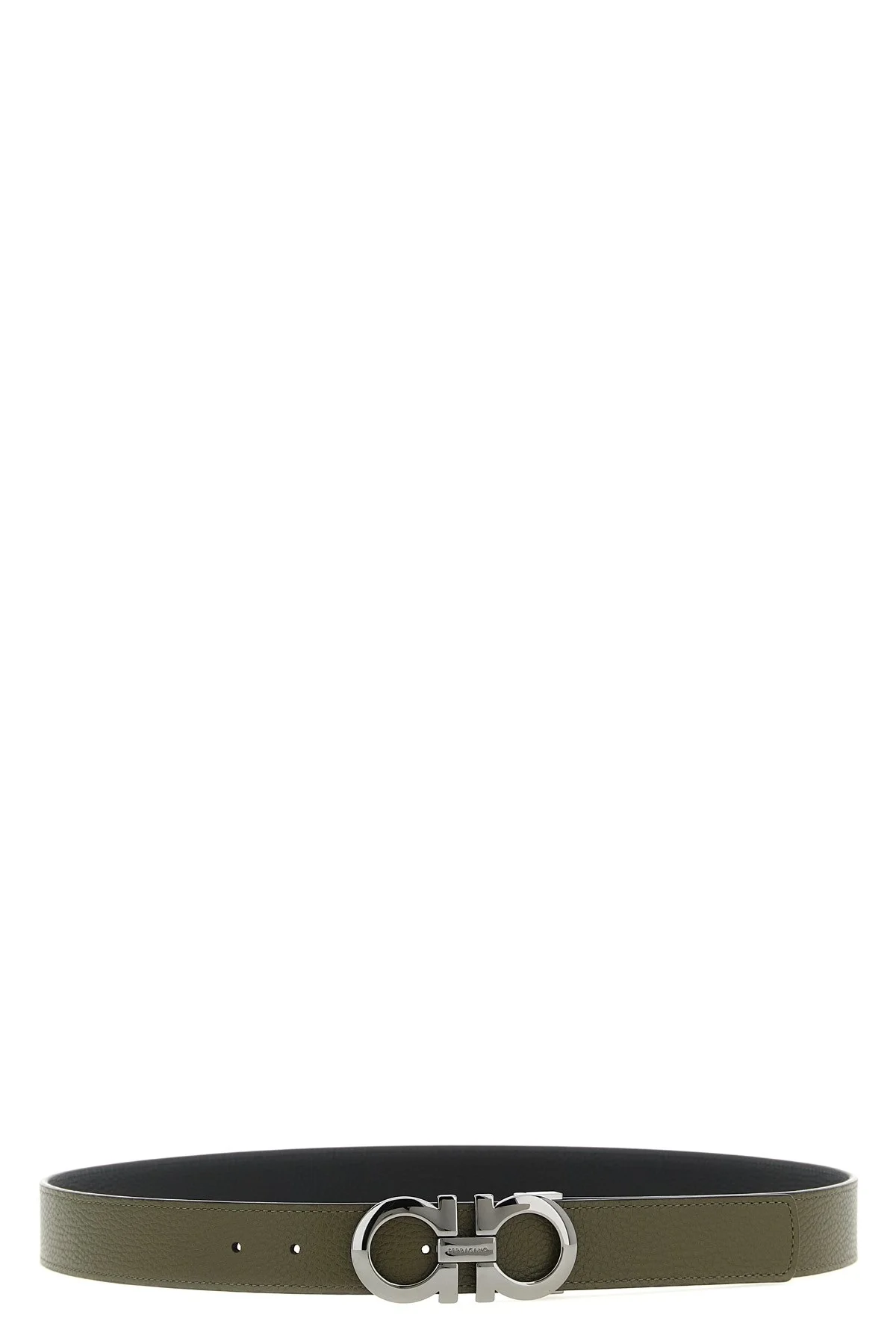cod. 790259NEWOLIVE Reversible hammered leather belt with metal 'Gancini' buckle. Color: Multicolor Size & Fit: H 3.5 cm Made in: Italy