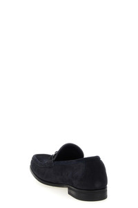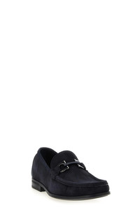 cod. 784285NAVY 'Grandioso' nubuck loafers with metal 'Gancini' clamp and front stitched tray, tubular construction model, flexible rubber sole. Color: Blue Size & Fit: US FERRAGAMO SIZE - EEE fit Composition: 100% calfskin leather (Bos Taurus) Made in: Italy