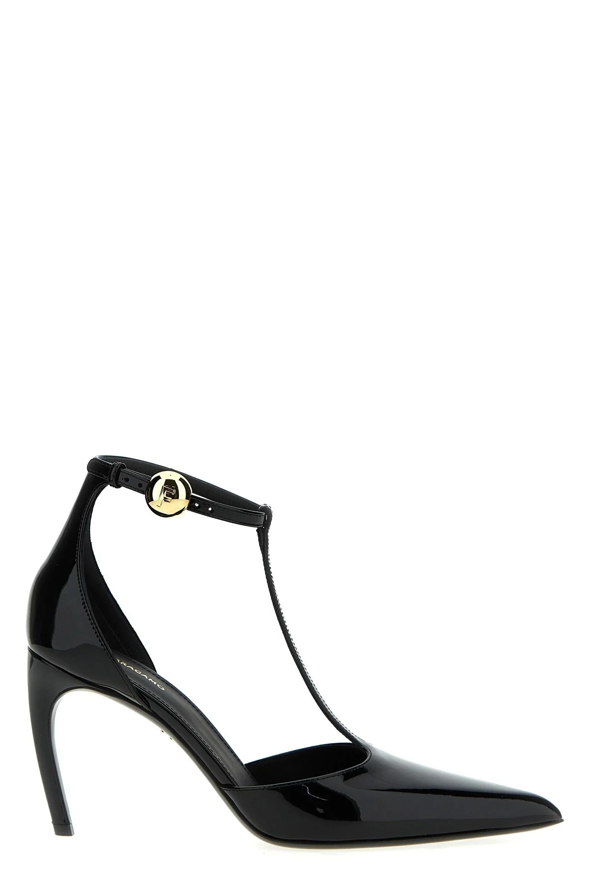 cod. 769281NERO 'Odette' patent leather pumps with ankle strap, contoured and curved heel. Color: Black Size & Fit: US FERRAGAMO SIZE C fit Heesl: 8.5 cm Composition: 100% calfskin leather (Bos Taurus)