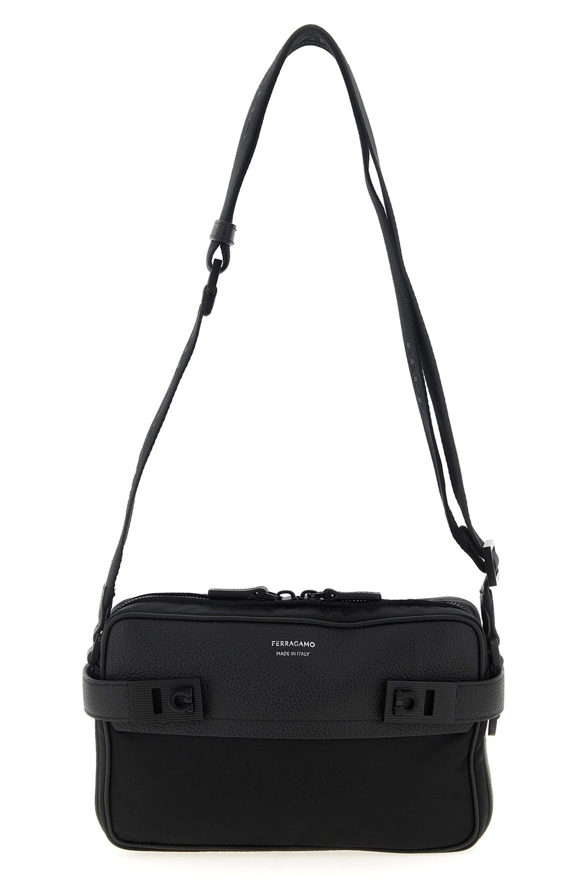 cod. 786274NERO 'Twins Nylon' crossbody bag in technical fabric and hammered leather, metal 'Gancini' buckle detail with painted and knurled finish, front embossed logo, top zip closure, adjustable jacquard ribbon shoulder strap. Color: Black Size & Fit: W 24 x H 16 x D 6 cm Composition: 80% fabric, 20% calf leather Made in: Italy
