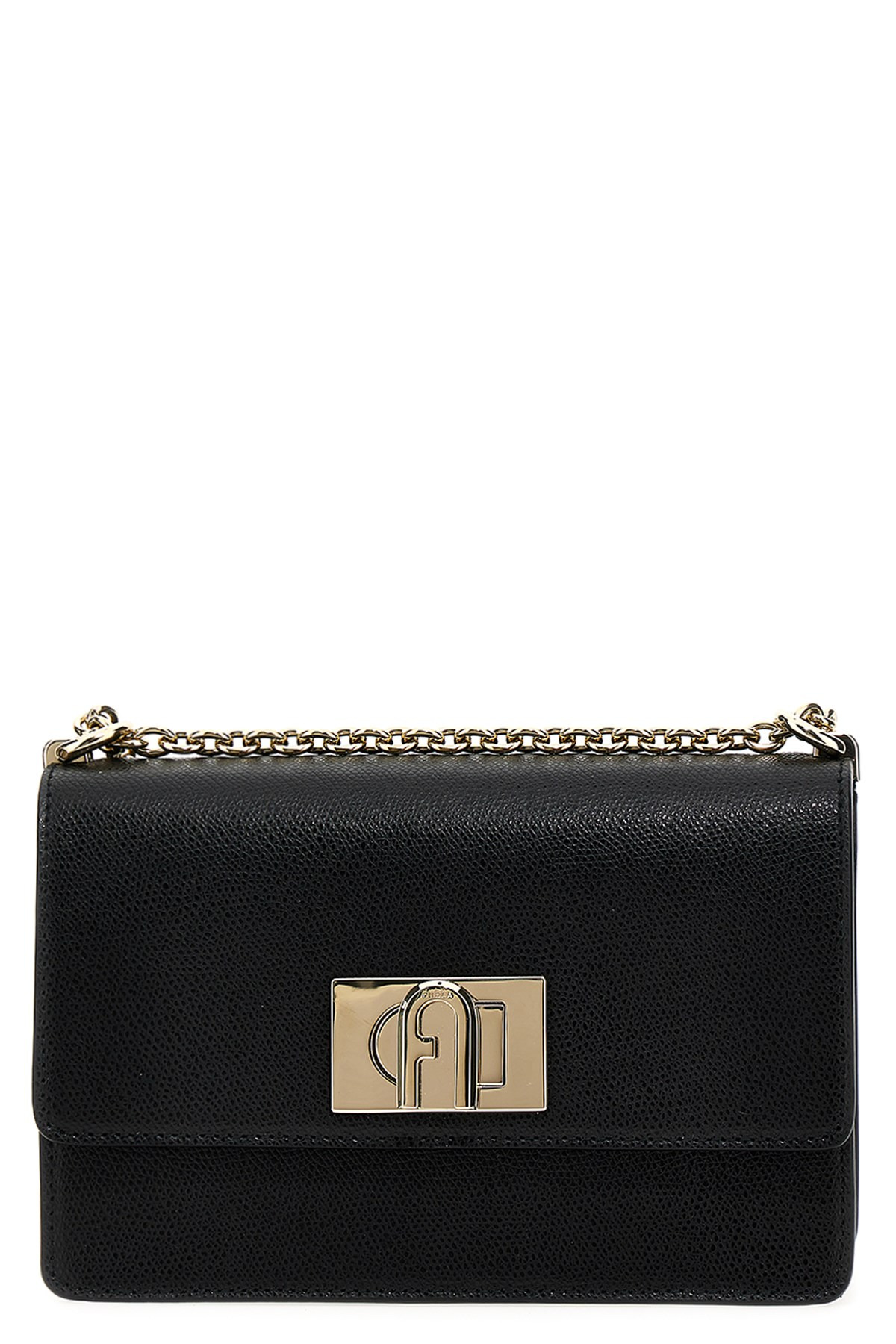cod. BAFKACOARE000O6000 'Furla 1927' mini shoulder bag in fine textured leather, flap closure with metal swivel with Arco logo, back pocket, sliding chain strap with leather protector. Color: Black Size & Fit: W 20 x H 13 x D 7 cm Composition: 100% leather Made in: Bulgaria