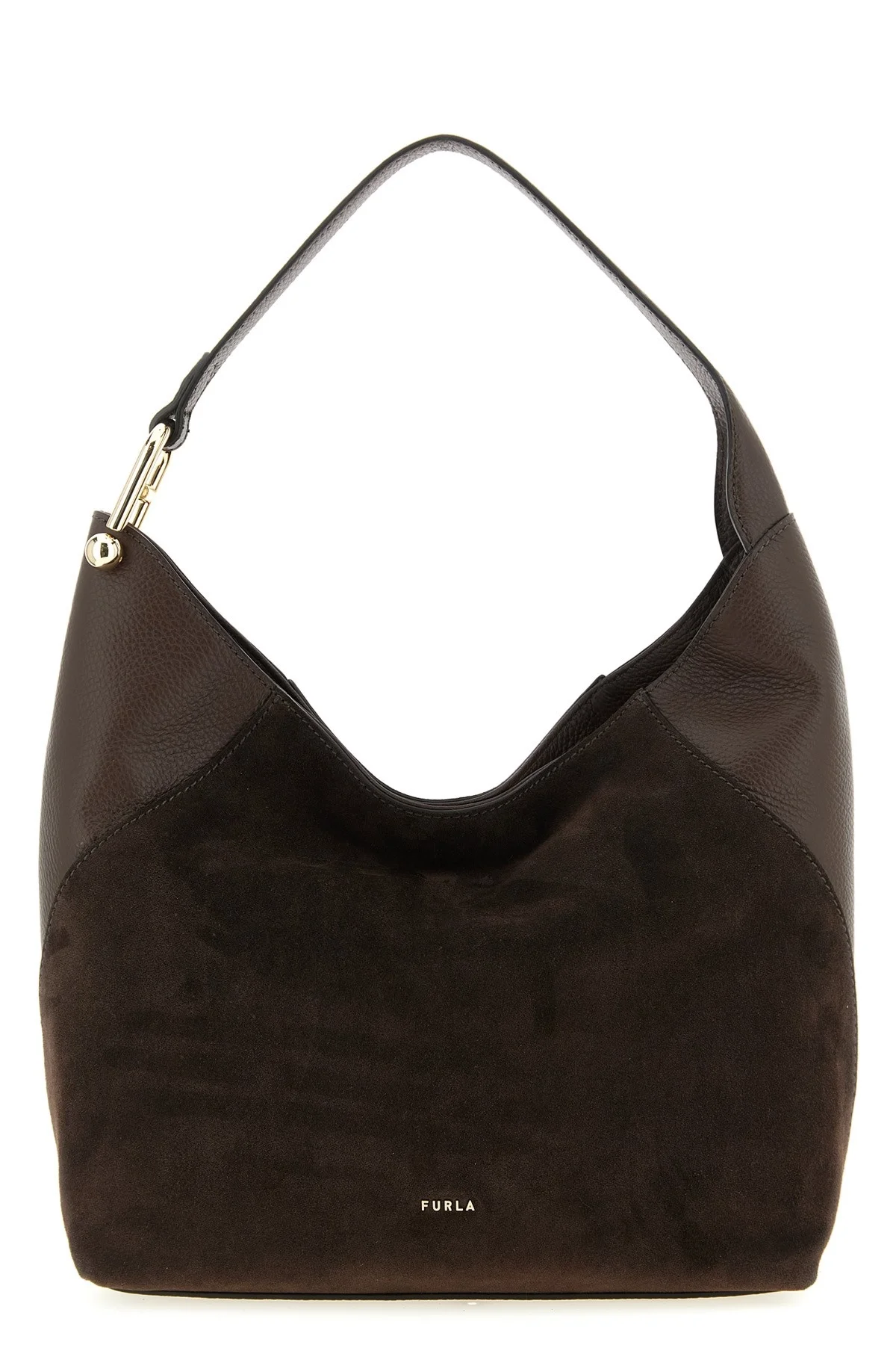 cod. WB01900BX18954286S 'Furla Lara' medium shoulder bag in suede and smooth tone-on-tone calf leather, front metal lettering logo, magnetic closure, fixed handle with iconic Arco logo with metal ball element. Color: Brown Size & Fit: W 29 x H 25 x D 11 cm Composition: 100% calfskin leather (Bos Taurus) Made in: Bulgaria