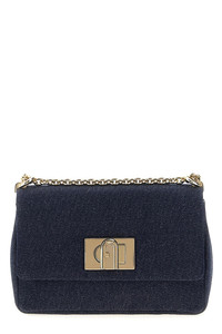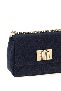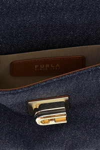 cod. BAFKACODE00002677S MINI denim shoulder bag with turn lock closure with Arco logo, chain shoulder strap with fabric, and exterior pocket. Color: Blue Size & Fit: W 19.5 x H 12 x D 9 CM Composition: 90% cotton 10% cotton Made in: China