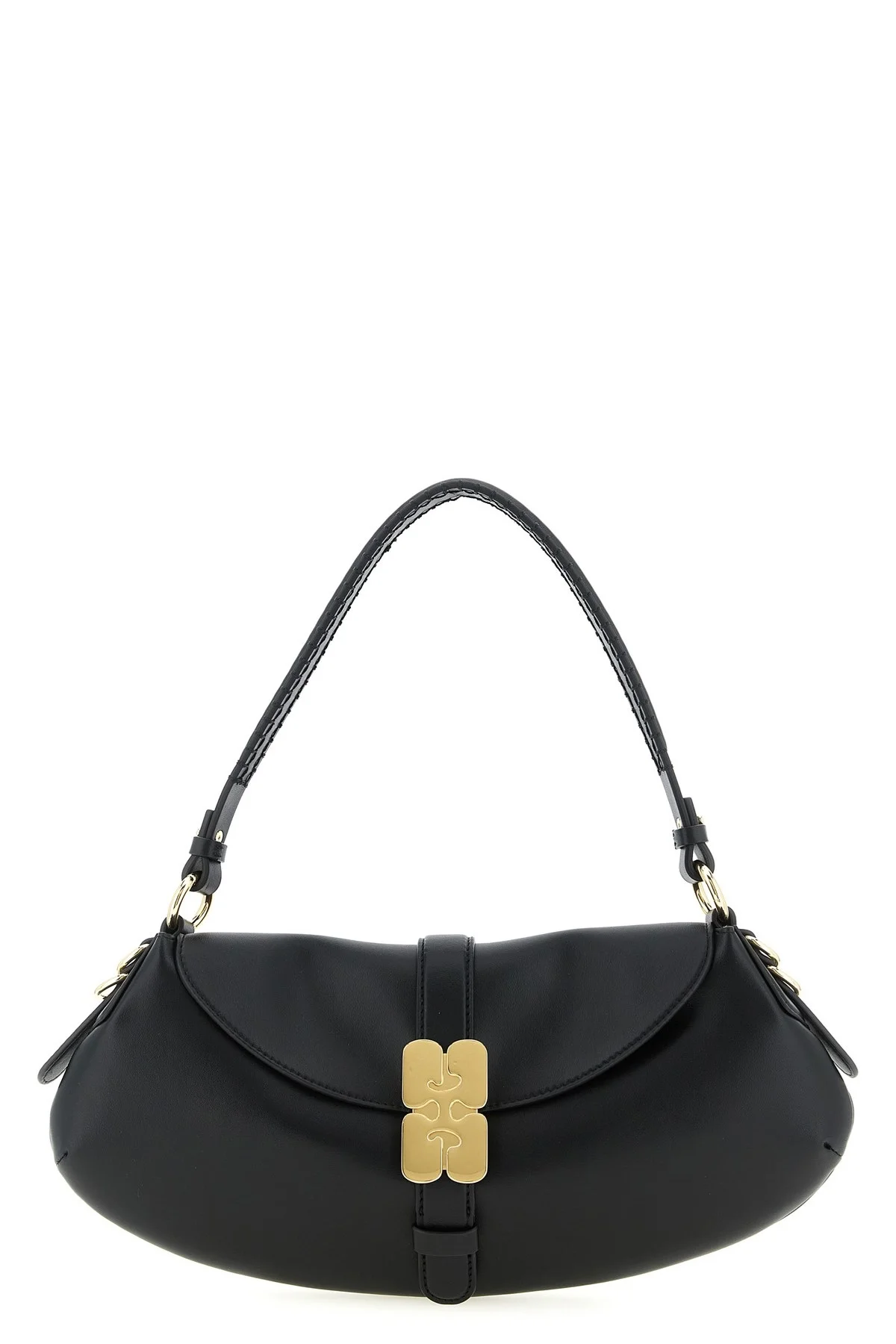 cod. B2070049099 B-Kat shoulder bag in leather-effect fabric with curved silhouette, magnetic flap closure with metal 'GANNI Butterfly' logo on the front, and removable handle. Color: Black Size & Fit: W 36 x H 18 x D 4 cm Composition: 51% lh 30% polyester 19% polyurethane Made in: China