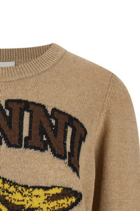 cod. A1070265118 Wool sweater, front knit with 'Banane' graphics, crew neck, long cuffed sleeves. Color: Beige Size & Fit: True to size fit Composition: 80% wool, 20% polyamide Made in: Moldova
