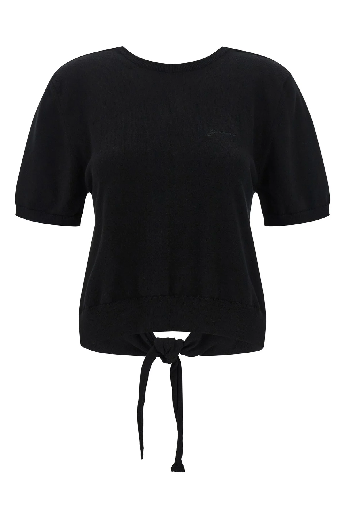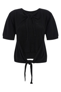 cod. A1070257099 Cotton sweater with tone-on-tone embroidered logo on the front, round neckline, bare back with knotted ribbons, and short sleeves with cuffs. SUSTAINABLE: This product is made of organic cotton. Color: Black Size & Fit: true to size fit Composition: 100% organic cotton Made in: Romania