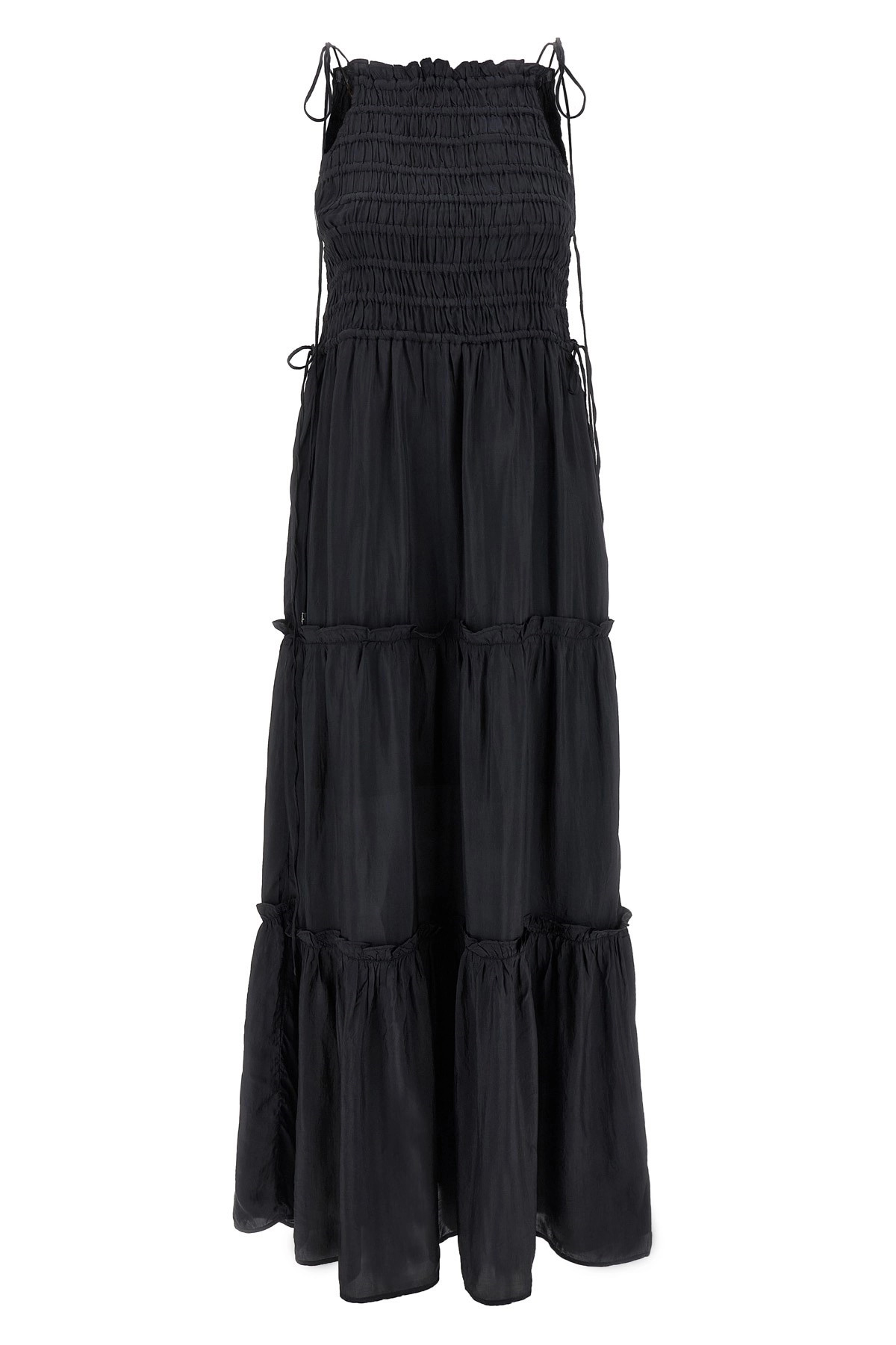 cod. W0571252 Long viscose dress Black Smock Tie with American-style neckline, smock stitch top, sleeveless with thin adjustable laces, drawstring at the waist, and layered wide skirt. Color: Gray Size & Fit: relaxed fit - EU size Composition: 100% viscose Made in: India