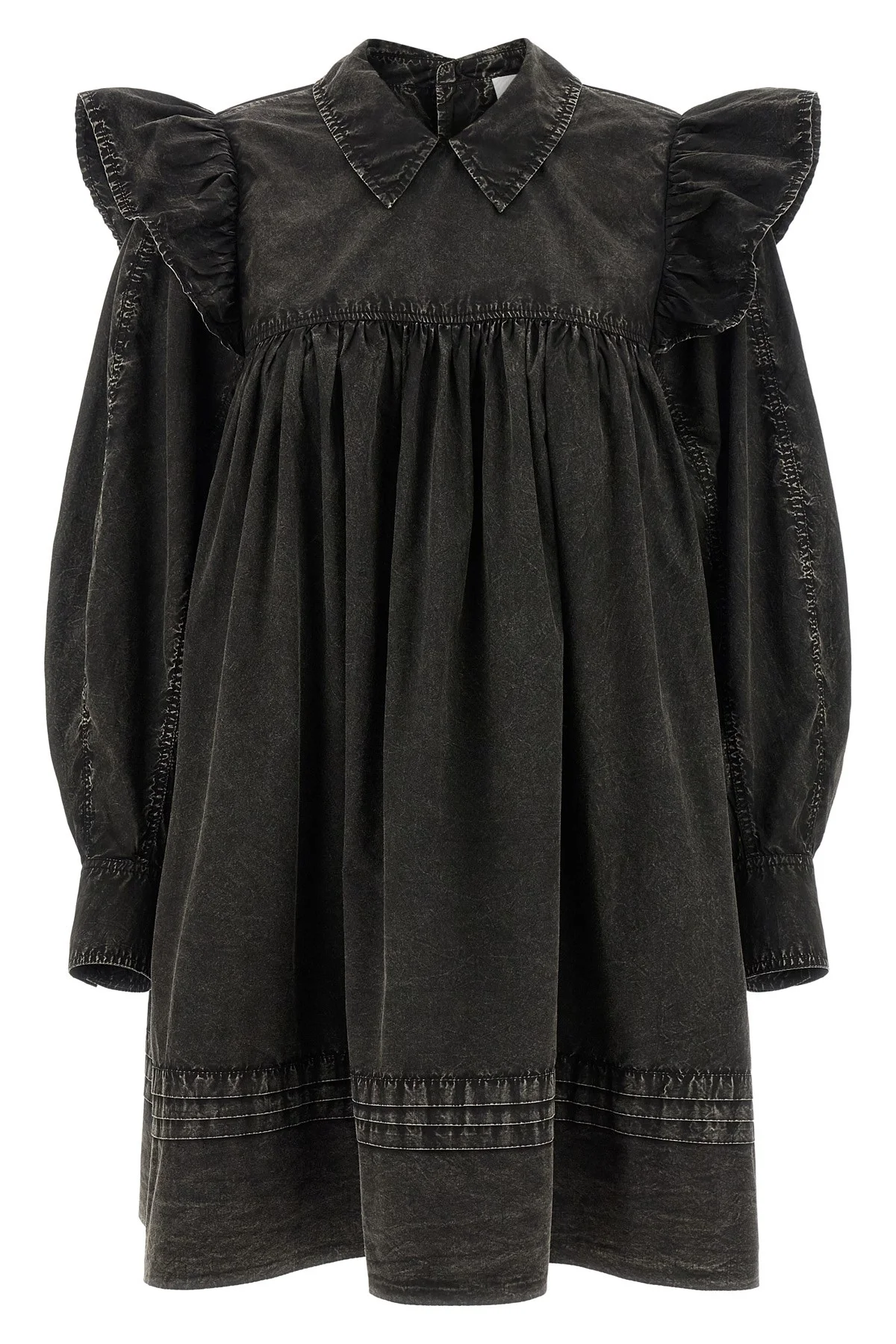 cod. A1030125099 'Black Washed Mini Shirt' cotton dress with delave effect garment, shirt model with curls and mini flounces front and back, long wide sleeves with cuffs and maxi ruffles on the shoulder, back button closure, pockets, unlined. SUSTAINABLE: This product is made of organic cotton. Color: Black Size & Fit: relaxed fit - EU size Composition: 100% organic cotton Made in: India