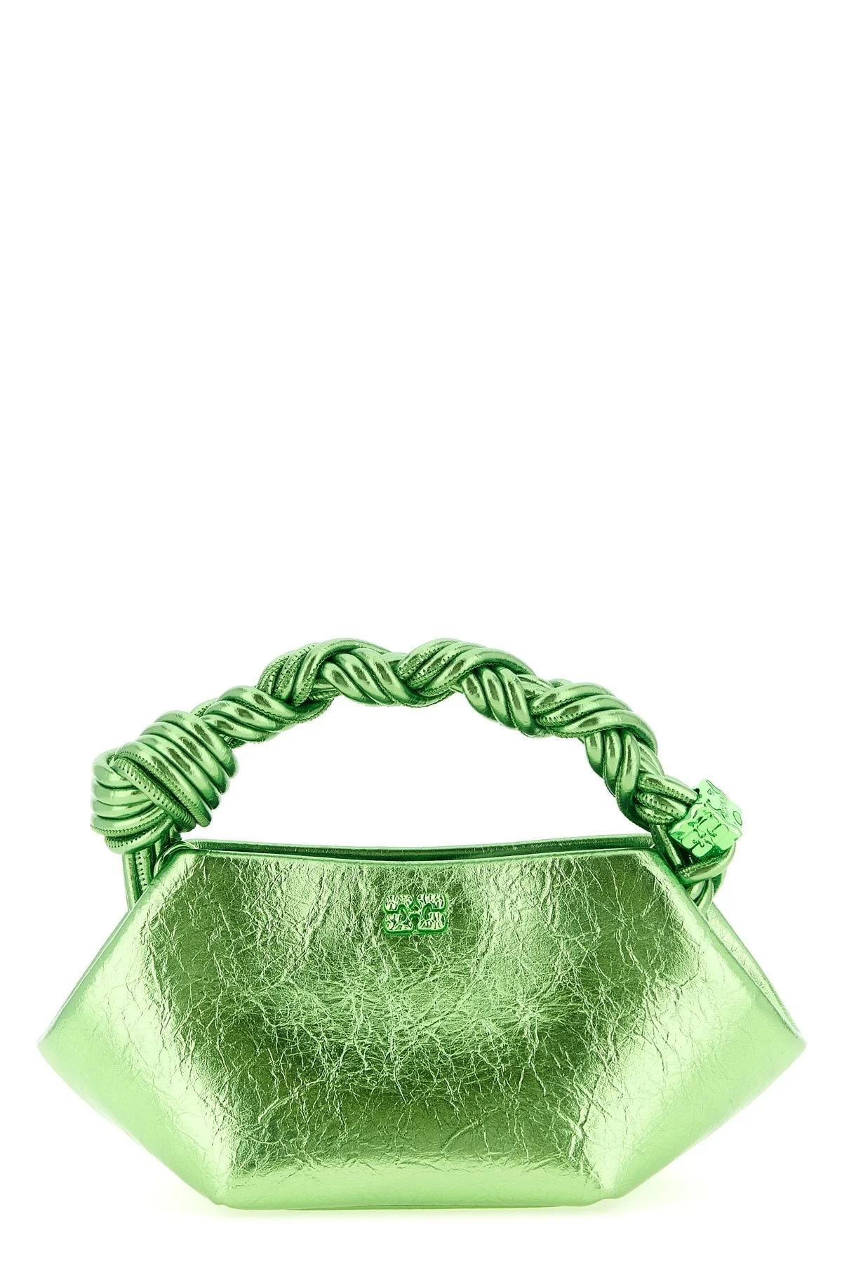 cod. B2100030ZZZ Bou' mini handbag in craquele metallic leather-effect fabric, tone-on-tone metallic 'Ganni Butterfly' logo on the front, inner magnetic closure, fixed braided handle with tone-on-tone metal knot and nut, adjustable and removable shoulder strap, and back embossed logo. SUSTAINABLE: product made from recycled materials. Color: Green Size & Fit: W 25 x H 11 x D 11.5 cm Composition: 60% polyurethane, 40% polyester Made in: China