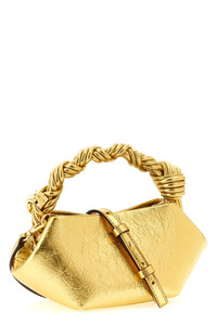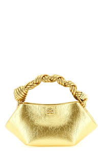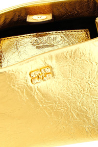 cod. B2100030339 Bou' mini handbag in craquele metallic leather-effect fabric, tone-on-tone metallic 'Ganni Butterfly' logo on the front, inner magnetic closure, fixed braided handle with tone-on-tone metal knot and nut, adjustable and removable shoulder strap, and back embossed logo. SUSTAINABLE: product made from recycled materials. Color: Gold Size & Fit: W 25 x H 11 x D 11.5 cm Composition: 60% polyurethane, 40% polyester Made in: China