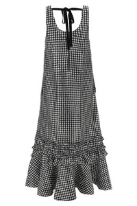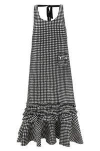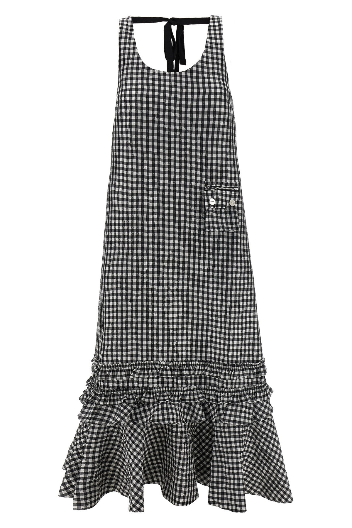 cod. W0463099 'Crinkled Check Long' sleeveless dress in crinkled vichy fabric with pocket, wide round neckline at the front and back with drawstring and back zip closure, ruffled skirt and flounces. SUSTAINABLE: Product made from recycled polyester. Color: Black Size & Fit: comfort fit - EU size Composition: 100% polyester Made in: Turkey