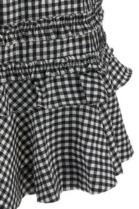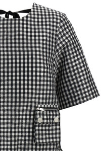 cod. W0464099 'Crinkled Check Mini' dress in crinkled vichy fabric with crewneck, short sleeves, pocket, wide round neckline at the back with drawstring and zip closure, skirt with ruffles and flounces. SUSTAINABLE: Product made from recycled polyester. Color: White/Black Size & Fit: true to size fit - EU size Composition: 100% polyester Made in: Turkey