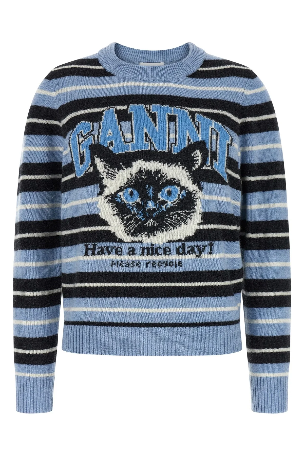 cod. A1070266326 'Graphic Wool' striped wool sweater with front jacquard graphics, crew neck, long cuffed sleeves. SUSTAINABLE: Product made with recycled materials. Color: Light Blue Size & Fit: true to size fit Composition: 45% wool 35% recycled wool 20% recycled polyamide Made in: Moldova