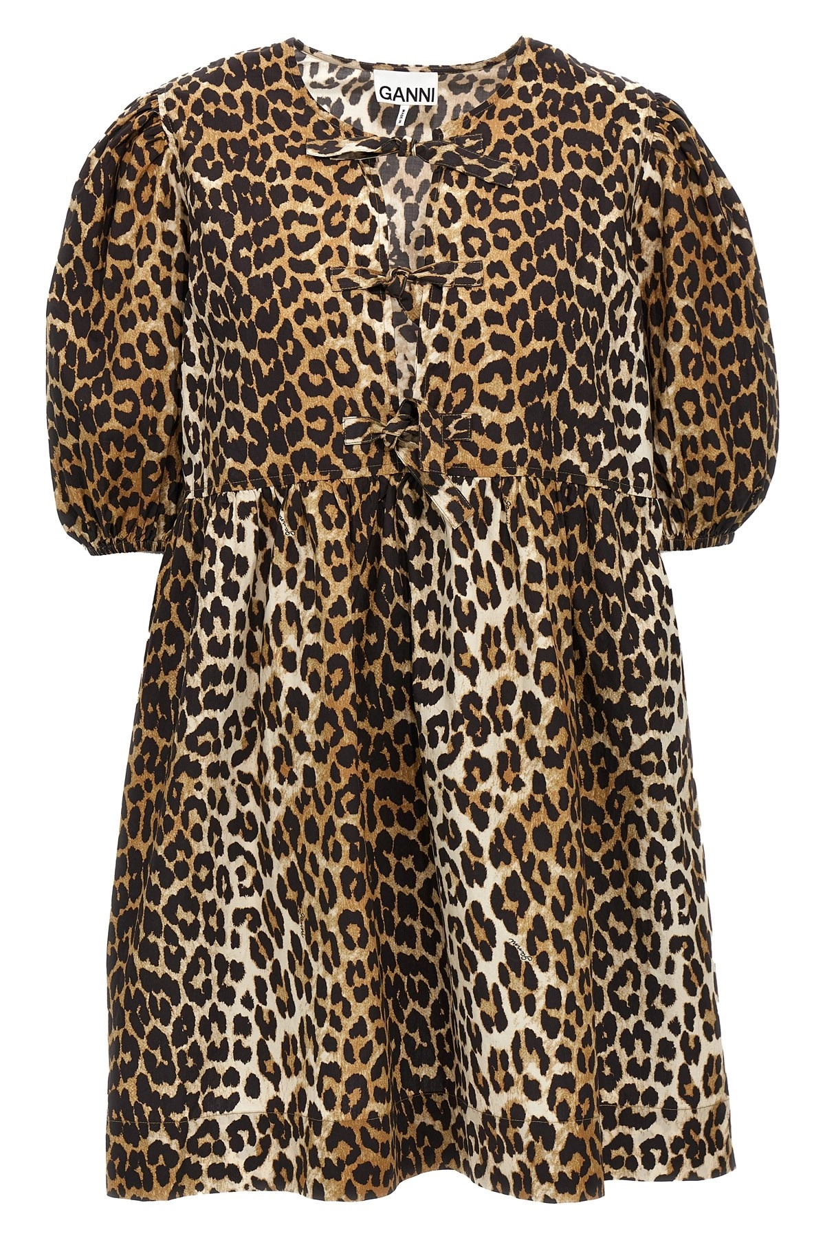 cod. F9758943 Leopard print cotton poplin dress with front knot detail, crew neck, short puff sleeves with elastic cuffs. SUSTAINABLE: This product is made of organic cotton. Color: Multicolor Size & Fit: true to size fit EU size Composition: 100% cotton Made in: India