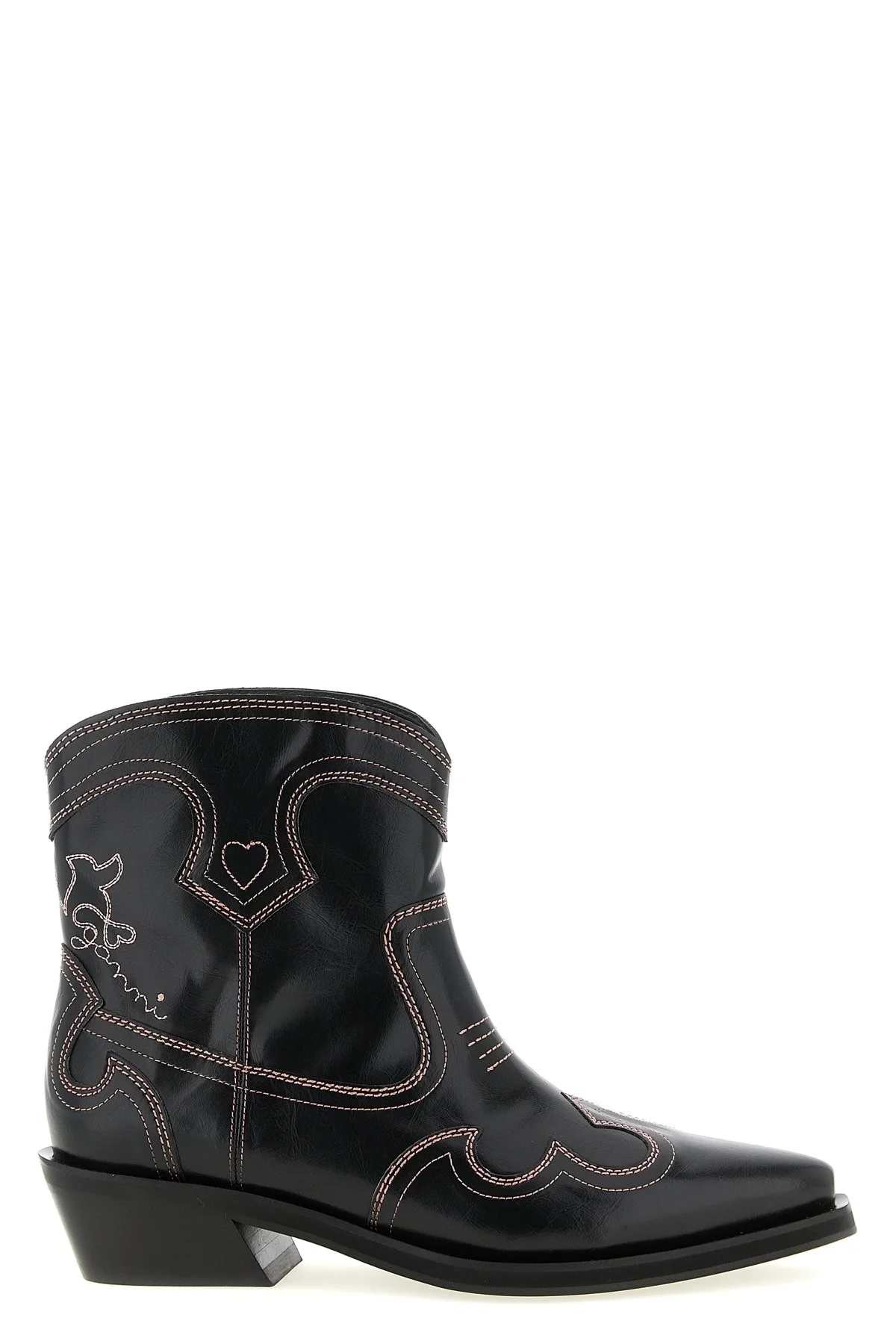 cod. B1010028475 'Low Shaft Embroidered Western' ankle boots in leather-effect fabric with contrast embroidery, Texan model, tapered toe, low angled heel, rubber sole. SUSTAINABLE: the article contains Oleatex™, a new generation material that is part of Ganni's Fabrics of the Future initiative. Oleatex™ is an innovative alternative to synthetic materials, made using byproducts from olive oil production to form a bio-based polyurethane (PU) top coating bonded to a cotton, viscose or recycled polyester backing. Color: Black Size & Fit: EU WOMEN Composition: 64% polyurethane 23% polyester 13% cotton Made in: Portugal