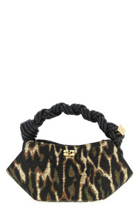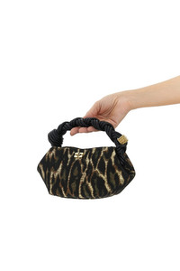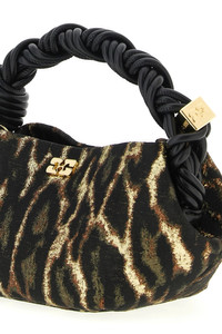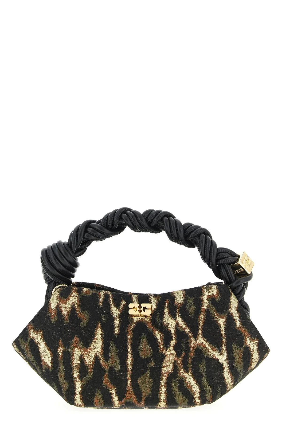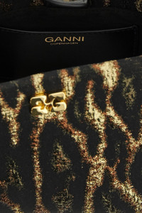 cod. B210006201X 'Metallic Cloque Bou' handbag in jacquard crafted with animal metal effect. fixed braided handle and metal details, Ganni Butterfly logo. Color: Brown Size & Fit: W 25 x D 11 x H 13 cm Composition: 70% polyester, 30% polyamide Made in: China