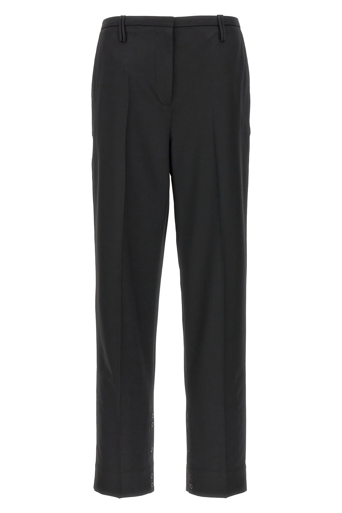 cod. F8679099 Viscose blend trousers, straight leg with stretched crease, hook and button zip closure, pockets, split detail with buttons on the bottom of the leg. Color: Black Size & Fit: true to size fit German size Composition: 48% viscose 47% polyester 5% elastane Made in: Turkey