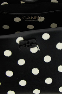 cod. B2100058099 'Polka-Dot Bou' mini handbag in leather-effect fabric with all-over polka dot print, fixed woven handle with metal detail engraved Ganni Butterfly logo, adjustable and removable shoulder strap. Color: Black Size & Fit: W 26 x H 18 x D 12 cm Composition: 65% lh 19% pu 16% pl Made in: China