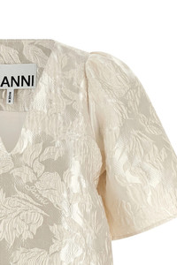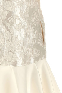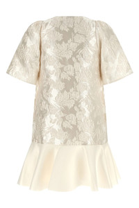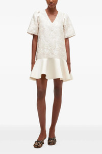 cod. A1030105135 'Satin Cloque' jacquard mini dress, V-neck, slightly puff short sleeves, side zip closure, curled flounce on the hem. Color: White Size & Fit: True to size fit EU SIZING Composition: 90% polyester, 10% polyamide Made in: China