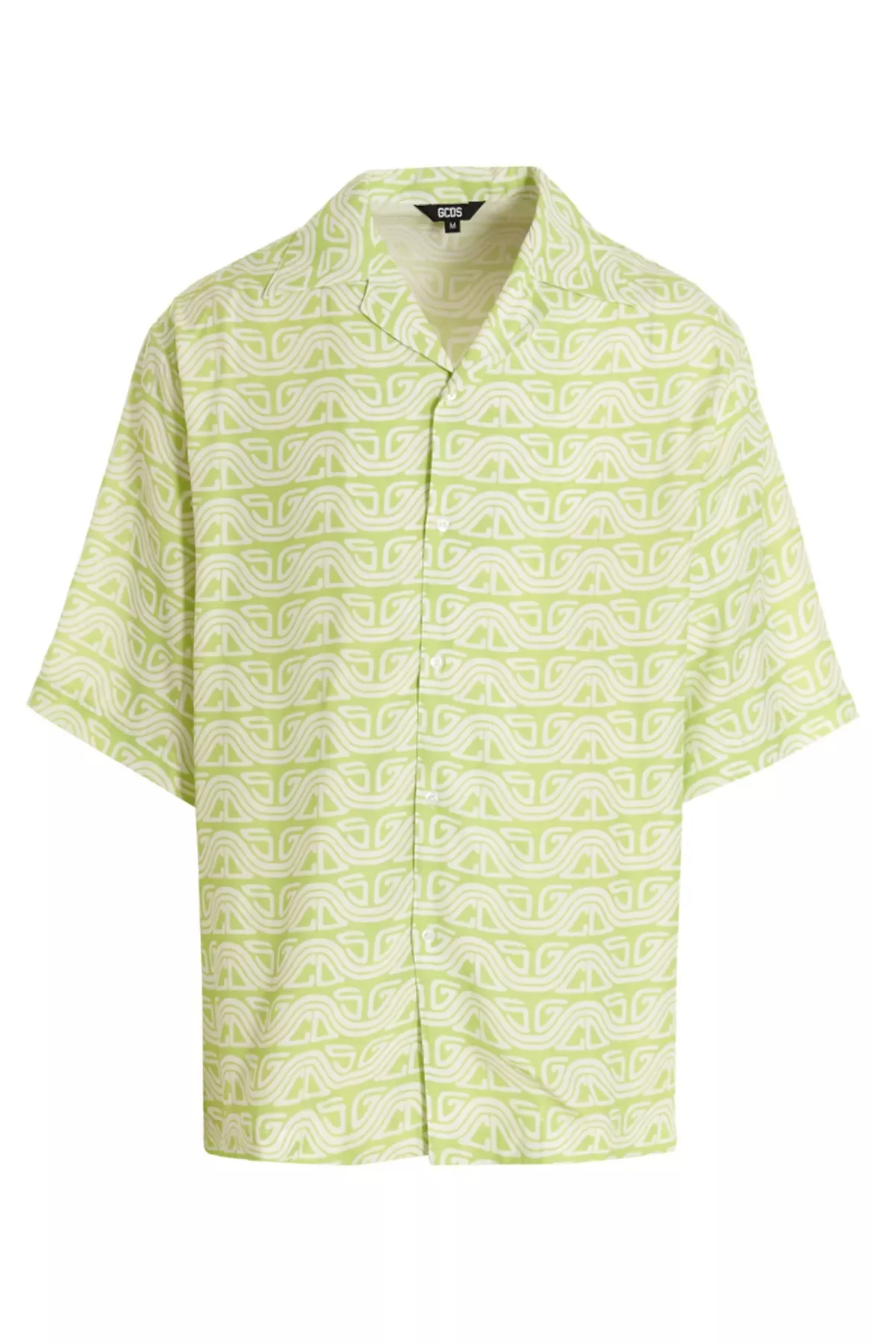 cod. SS23M24072351 Viscose shirt with all-over 'Waved Logo' print, button closure, short sleeves. Color: Green Main: 100% viscose Made in: Italy Size & Fit: True to size fit