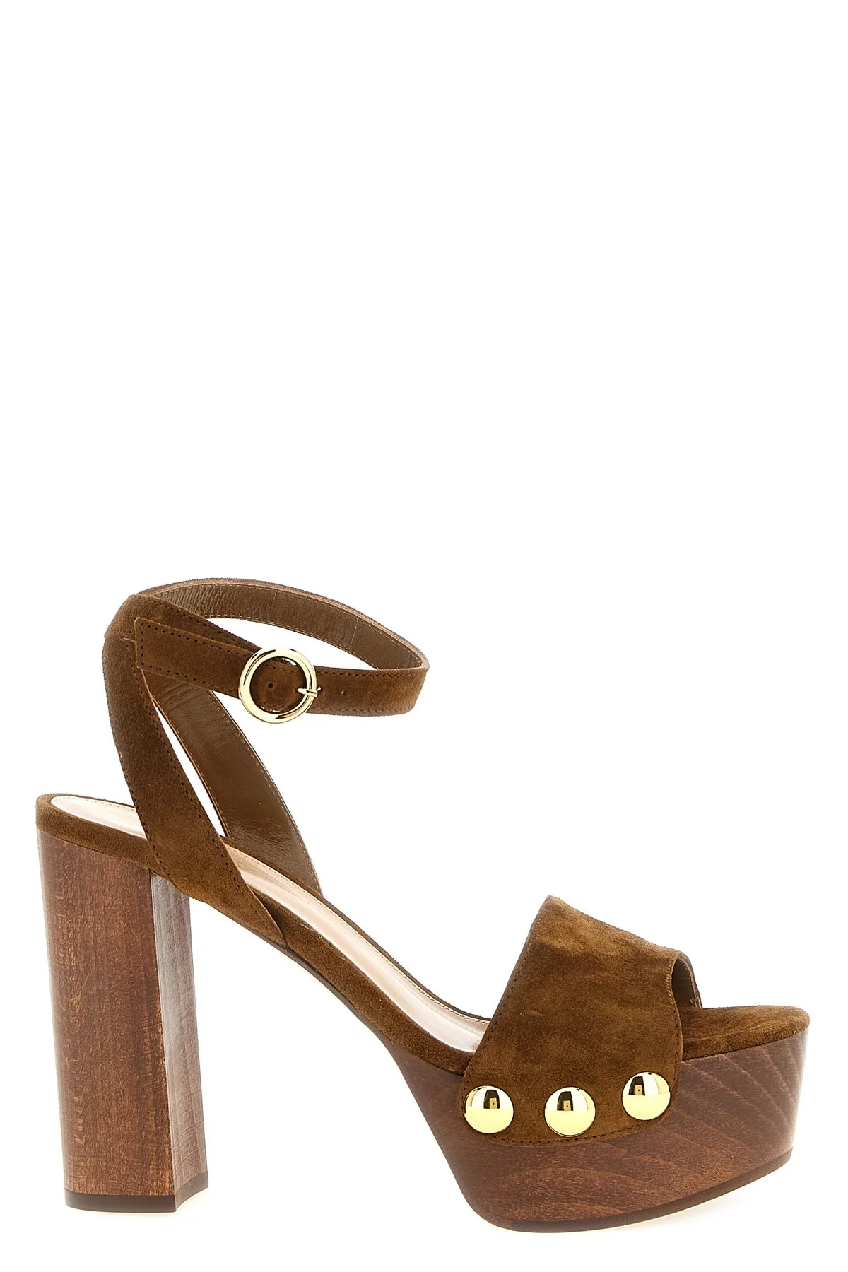 cod. G3275370LEGCAMTEXA 'Ardea' suede sandals with rounded toe, oversized metallic studs, wooden wide heel and platform, rubber sole. Color: Brown Size & Fit: EU WOMEN Heels: 11 cm - Platform: 4 cm Composition: 100% suede leather Made in: Italy