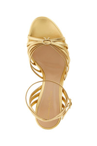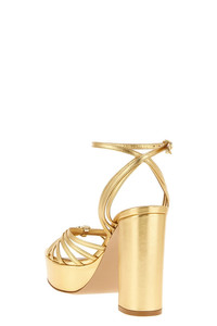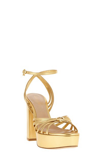 cod. G3263270RICNPSMEKO 'Rita' metallic nappa leather sandals platform style with front crossed straps and metal logo, adjustable ankle strap with buckle. Color: Gold Size & Fit: EU WOMEN Heel: 12 cm Composition: 100% lamb leather (Ovis aries) Made in: Italy