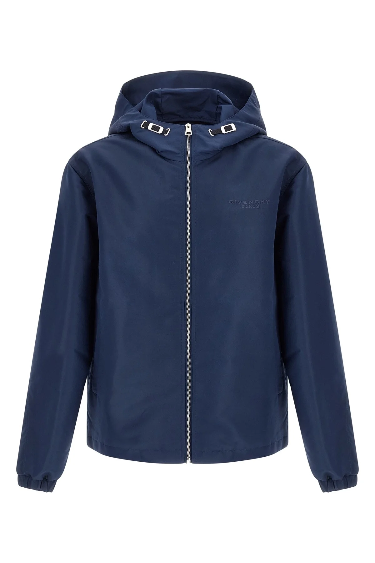 cod. BM01G2166P410 Water-repellent polyfaille anorak, adjustable hood, high neck, tone-on-tone 'Givenchy Paris' logo embroidery and front zip closure, pockets, long sleeves with elastic cuffs, drawstring on the hem. Color: Blue Size & Fit: true to size fit Composition: 100% polyester Made in: Italy