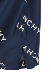 cod. BM616J1673410 All-over 'GIVENCHY Shadow' print silk shirt with bowling style, Hawaiian collar, front button closure, short sleeves, side slits, and asymmetric hem. Color: Blue Size & Fit: comfort fit - COLLAR size Composition: 100% silk Made in: Italy