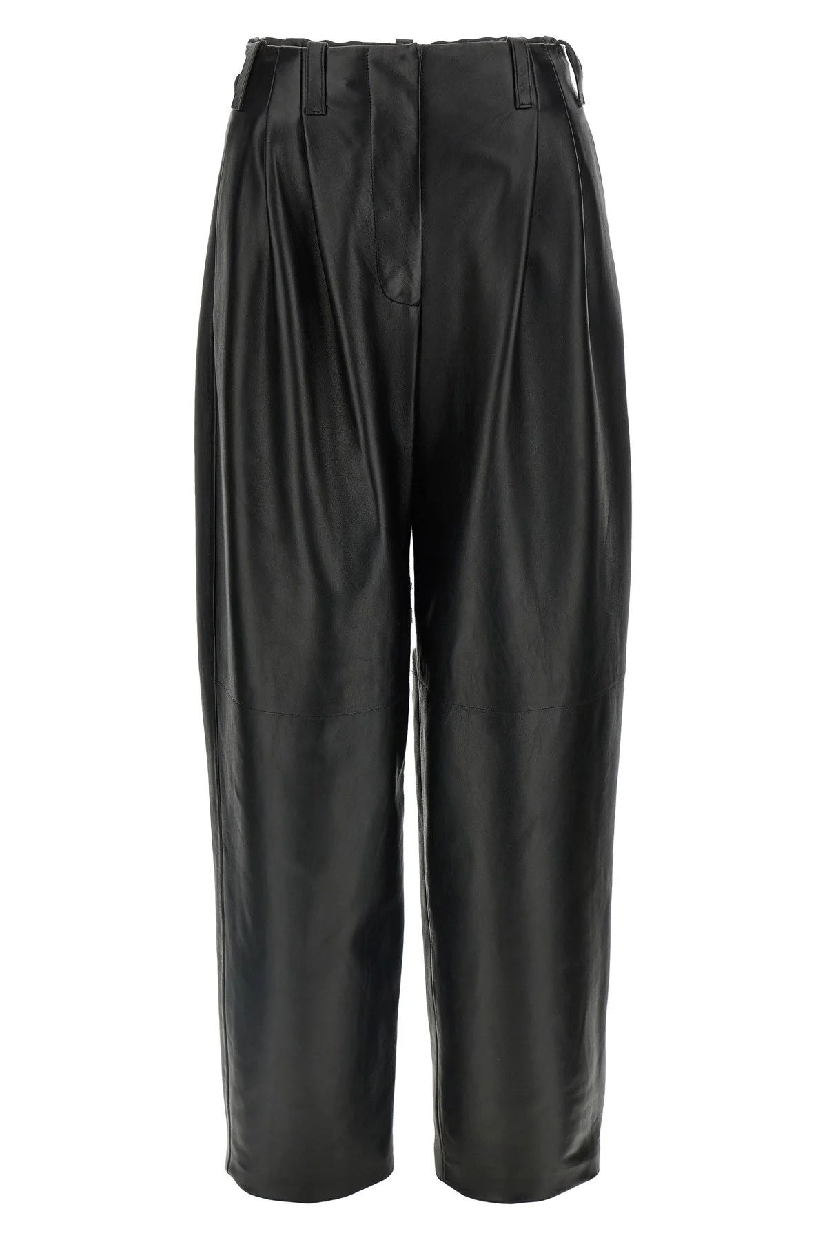 cod. BW5176604J001 Longe lambskin pants with double front pleats, elastic waistband at the back, pockets, hook and button zip closure, wide and straight leg, high waist. Color: Black Size & Fit: true to size fit - FRENCH size Composition: 100% lamb leather (Ovis aries) Made in: Italy