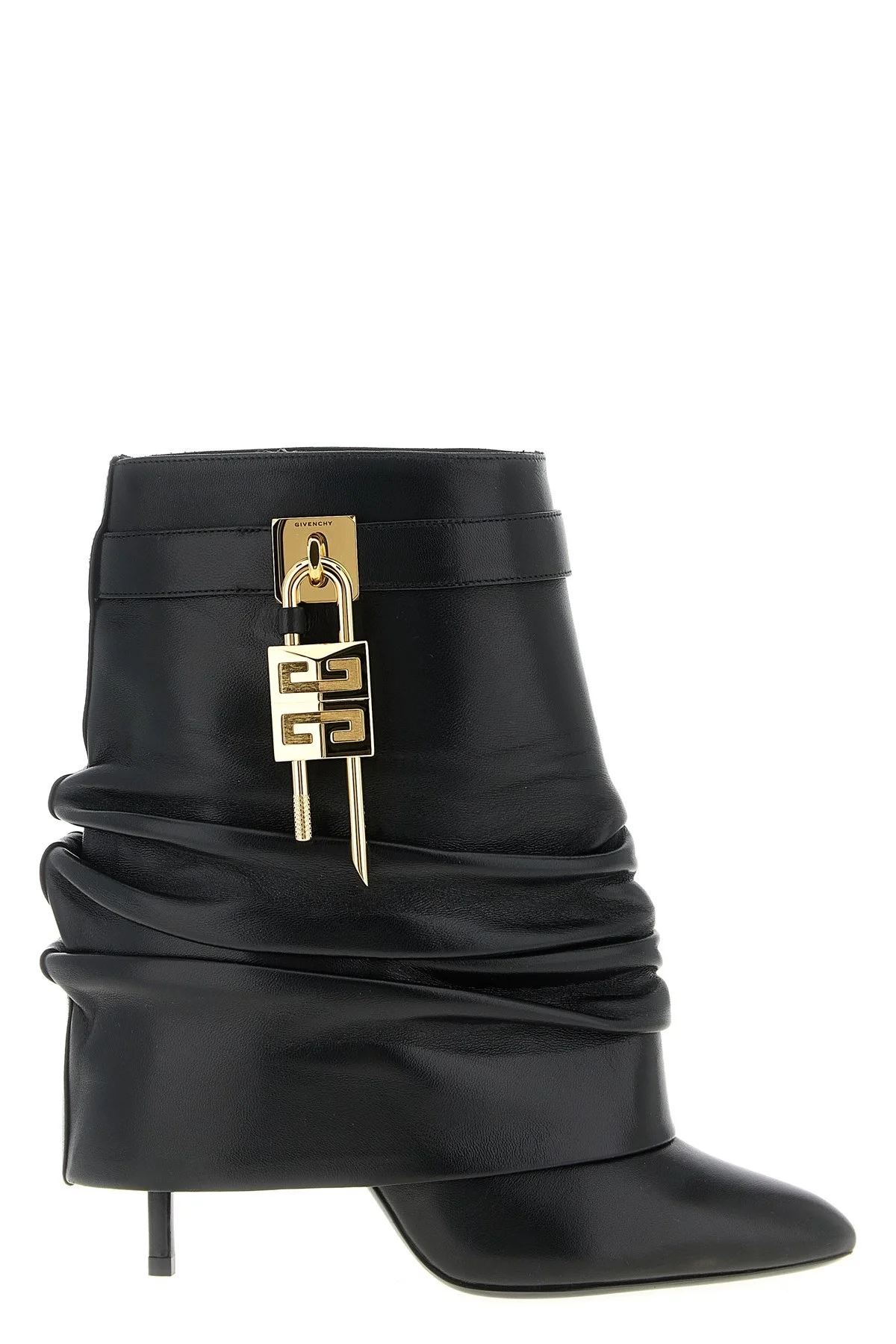 cod. BE604RE2AF001 Nappa ankle boots, 'Shark Lock Stiletto' line, tube leg with curls, almond toe, leather band with GIVENCHY metal clasp and 4G padlock on the right side, metal GIVENCHY padlock on the left side, covered stiletto heel, leather sole. Color: Black Size & Fit: EU WOMAN - Heels: 9.5 cm Composition: 100% sheepskin leather (Ovis Aries) Made in: Italy