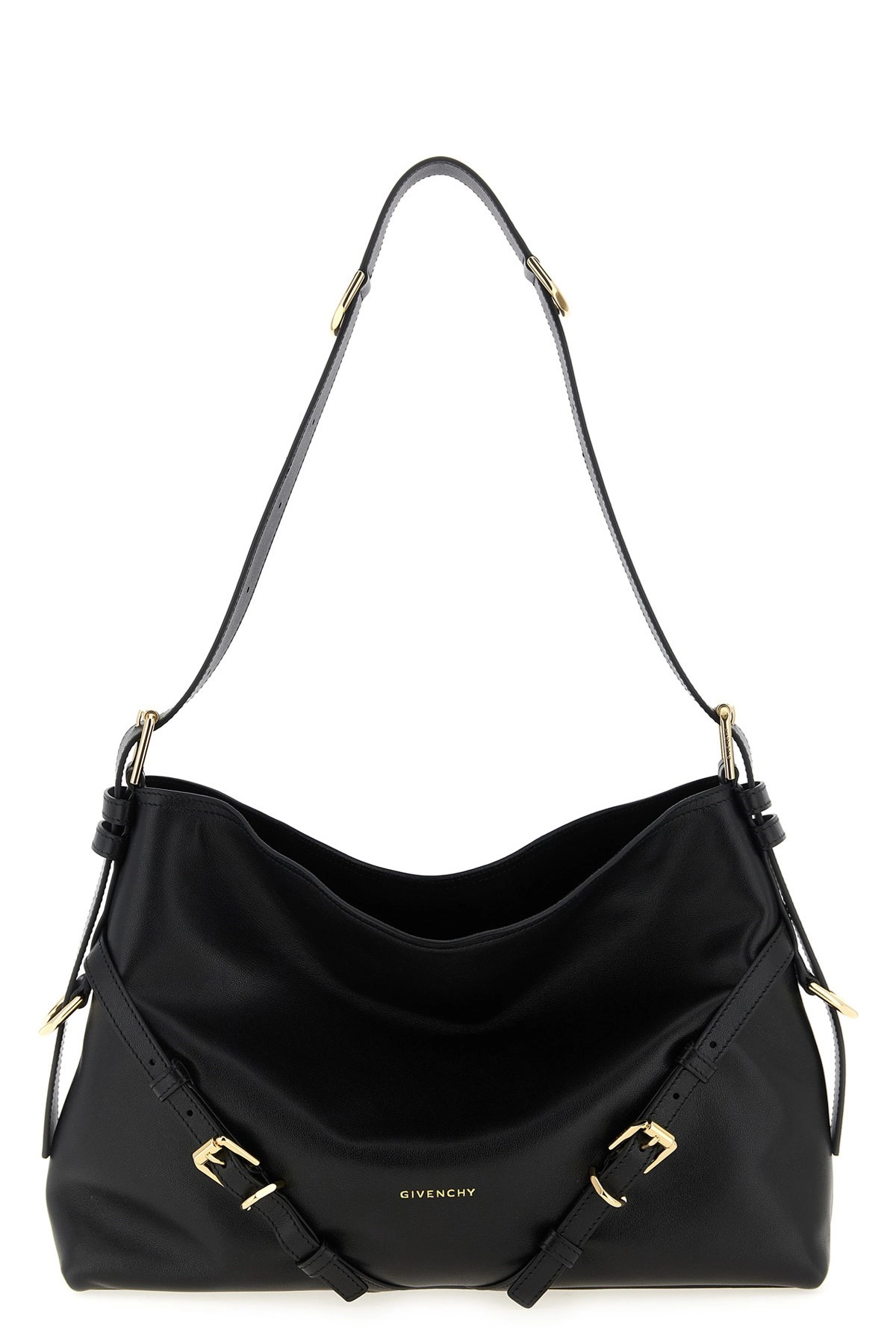 cod. BB5131B2AE001 'Voyou' shoulder bag in high-quality, smooth and shiny calf leather, soft V-silhouette, embossed logo and front metal buckle strap detail, adjustable shoulder strap, tone-on-tone suede lining. Color: Black Size & Fit: W 38 x H 28 x D 10 cm Composition: 100% calfskin leather (Bos Taurus) Made in: Italy