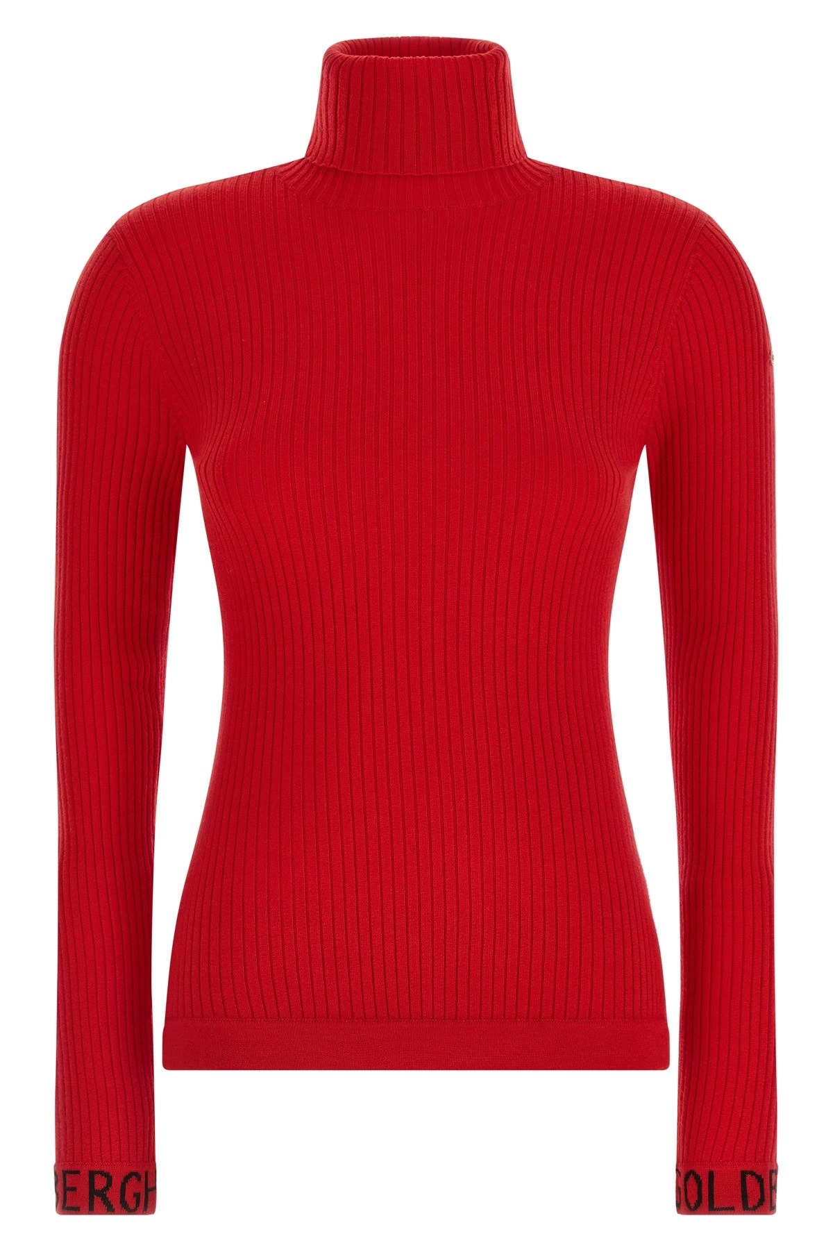 cod. GB400202534460 'Mira' turtleneck sweater in ribbed stretch merino wool blend with turned-up high neck, long sleeves with logo intarsia and tone-on-tone metal tag applique. Color: Red Size & Fit: true to size fit Composition: 45% acetate 30% we 25% nylon Made in: China
