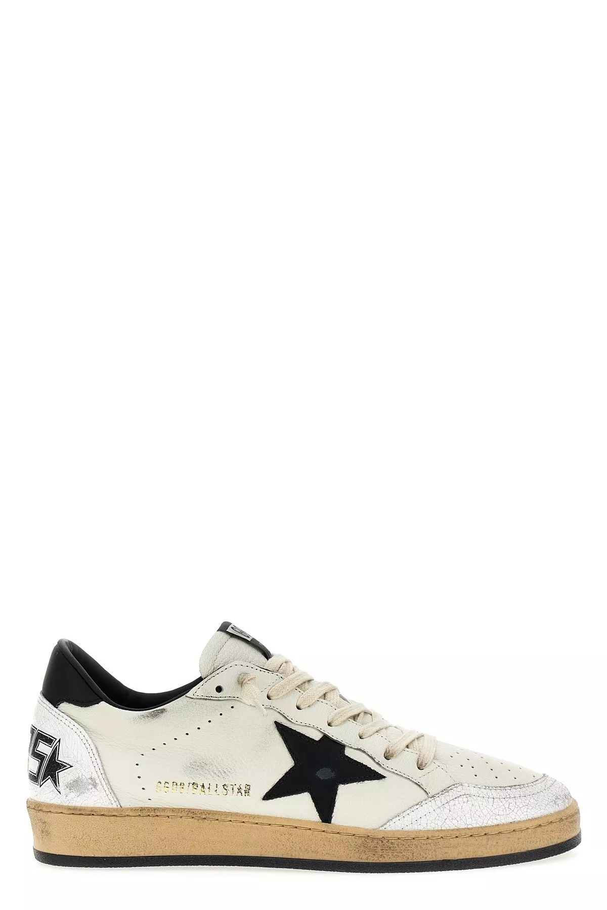 cod. GMF00117F0037711028310283 'Ball Star' leather sneakers with side star and contrast heel, lace-up closure, rubber sole, used-effect details. Color: White/Black Size & Fit: EU MEN Composition: 74% goat leather 26% cow leather Made in: Italy