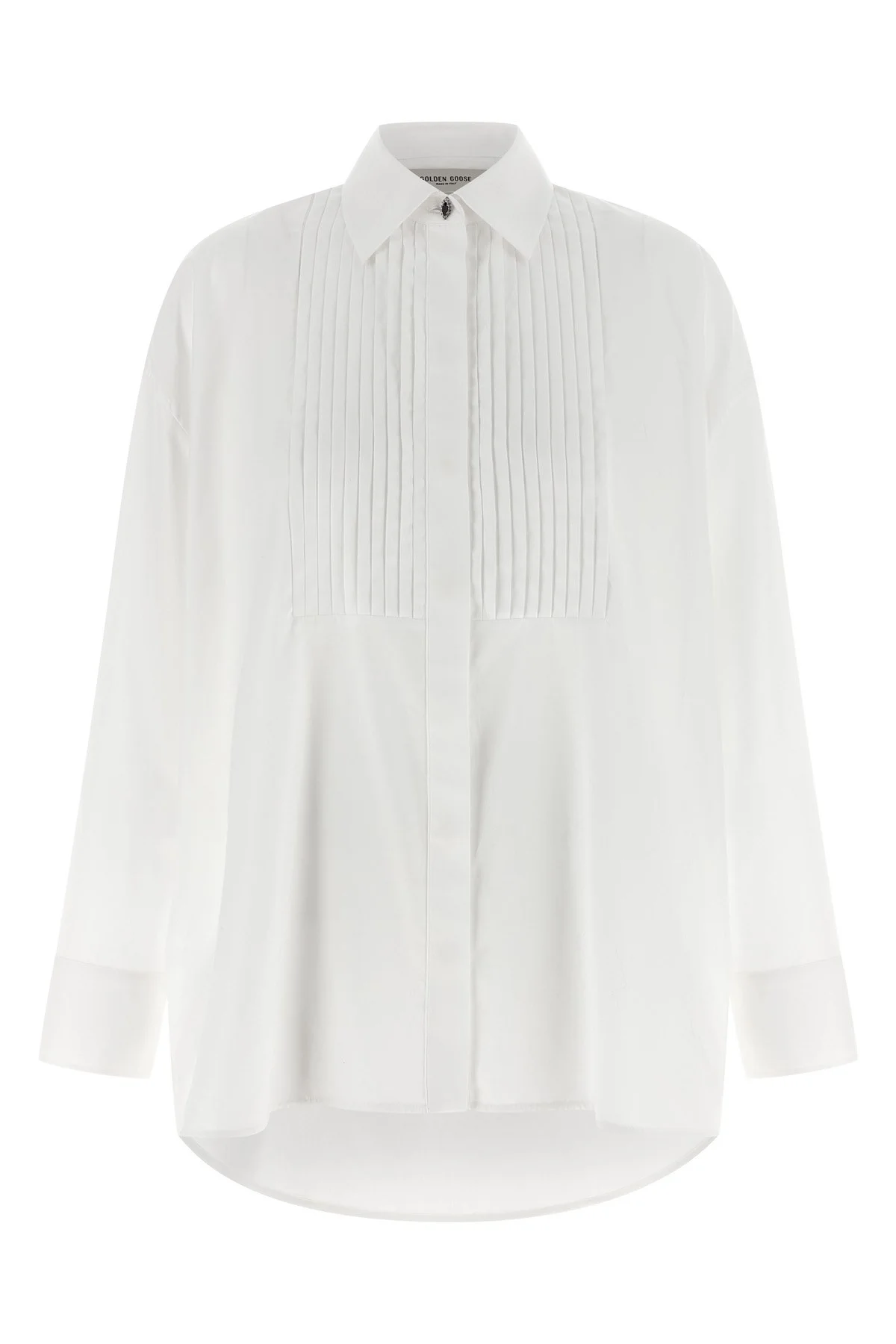 Women's oversized shirt in white cotton with pleated detail and jewel buttons
