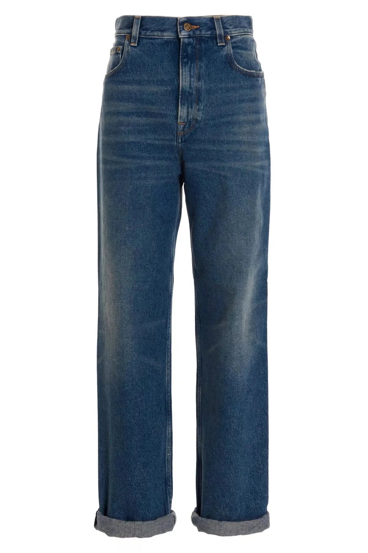 cod. GWP00844P0006215010050100 Kim' medium stone washed five-pocket denim jeans with straight leg, a zip and button closure. Color: Blue Size & Fit: True to size fit Composition: 100% cotton