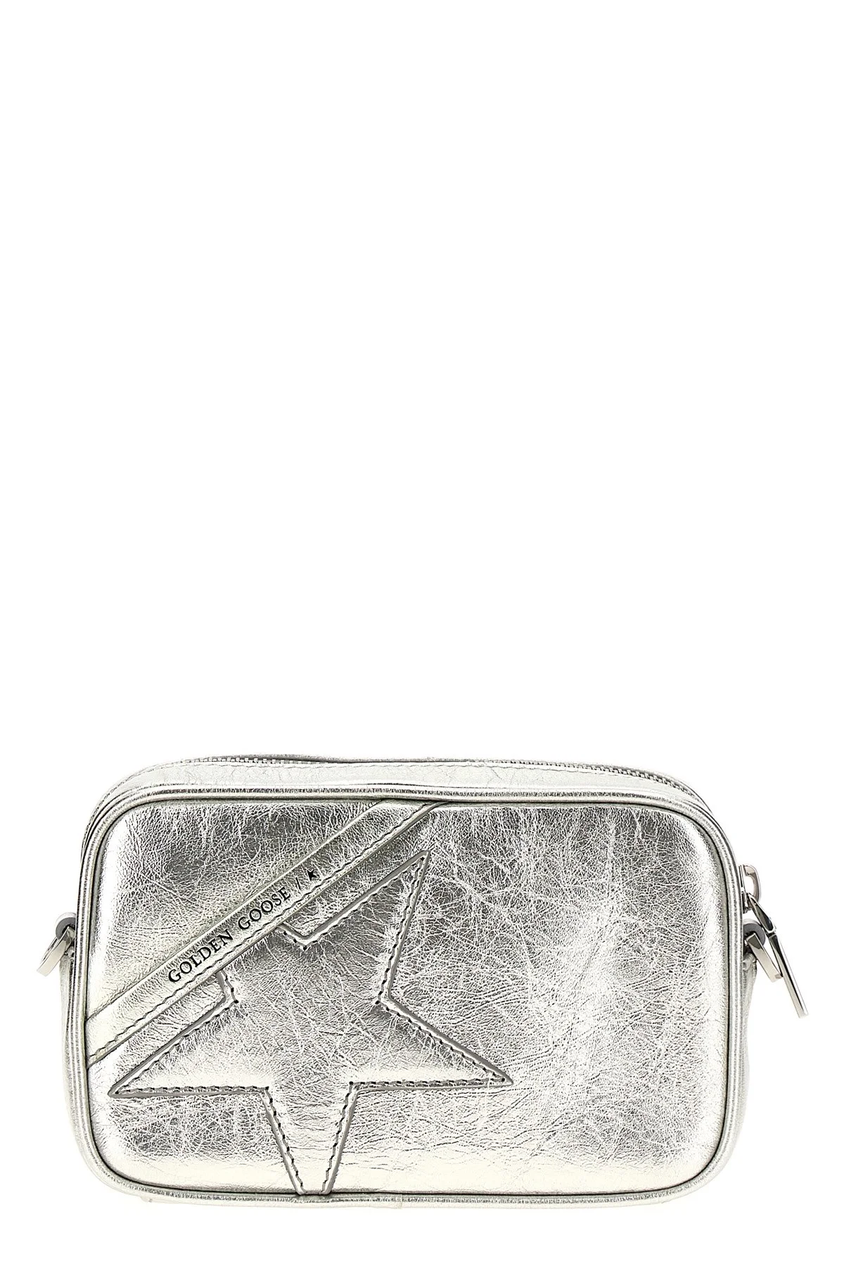 cod. GWA00228A0003357014070140 'Mini star' wrinkled-effect patent leather crossbody bag with tone-on-tone logo patch, adjustable and removable shoulder strap and zip closure. Color: Silver Fabric: 100% cow leather Made in: Italy Size & Fit: W 17 x H 11 x D 6 cm