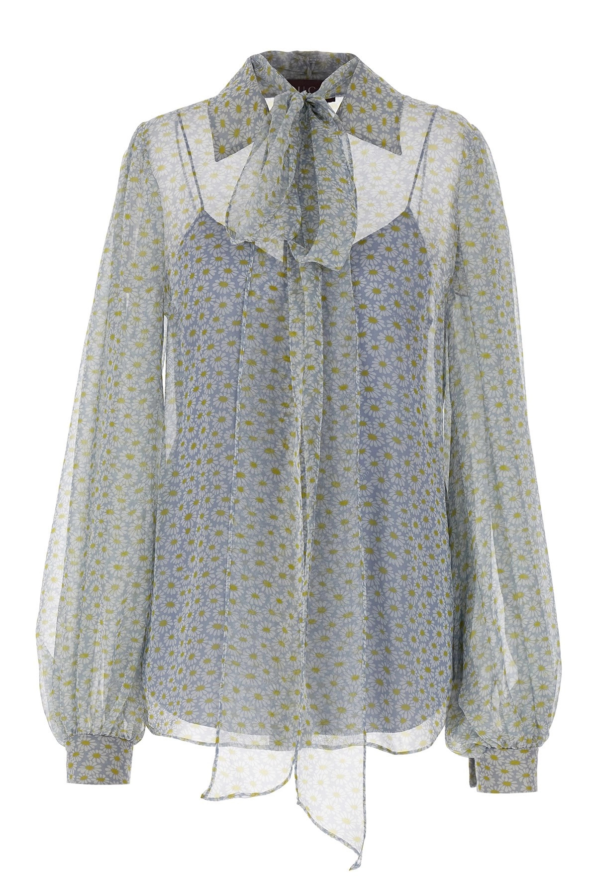 cod. 812225Z7AI41039 Silk chiffon shirt, with all-over print, semi-transparent with removable top, pointed collar and bow tied at the neck, long sleeves with cuffs. Color: Gray Size & Fit: True to size fit Composition: 100% silk Made in: Italy