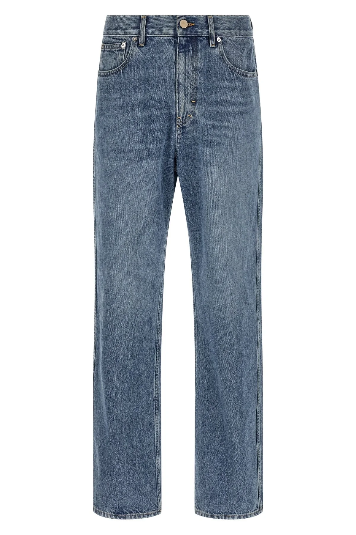 cod. 844629XDDD24009 Delave effect cotton denim jeans, straight leg, contrast stitching, zip and front button closure, five pockets, 'Gucci Rosso Ancora' naplak logo tag. Color: Blue Size & Fit: Slim fit Composition: 100% cotton Made in: Italy