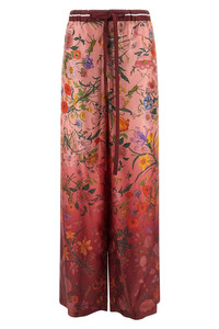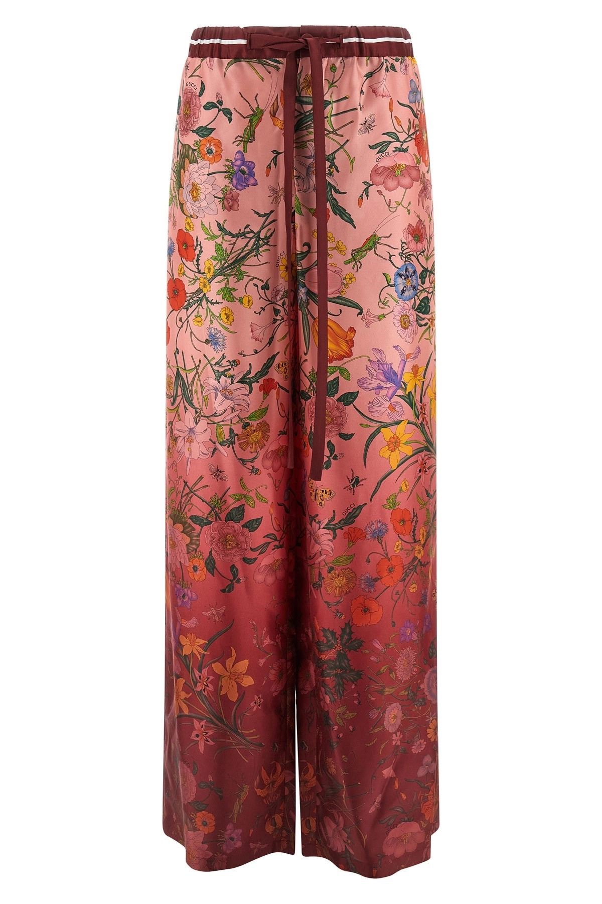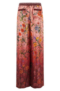 cod. 837980Z7AUH5057 Pink silk twill pants and all-over 'Gucci Rosso Ancora' shaded 'Flora' print, elastic with adjustable drawstring at the waist, zip and front button closure, pockets, wide and straight leg. Color: Pink Size & Fit: true to size fit Composition: 100% silk Made in: Italy
