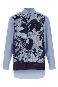 cod. 824032Z7AQZ4061 Striped cotton and silk twill shirt with front floral print, button closure, long cuffed sleeves, and asymmetric hem. Color: Light Blue Size & Fit: true to size fit - COLLAR US size Composition: 100% cotton Made in: Italy