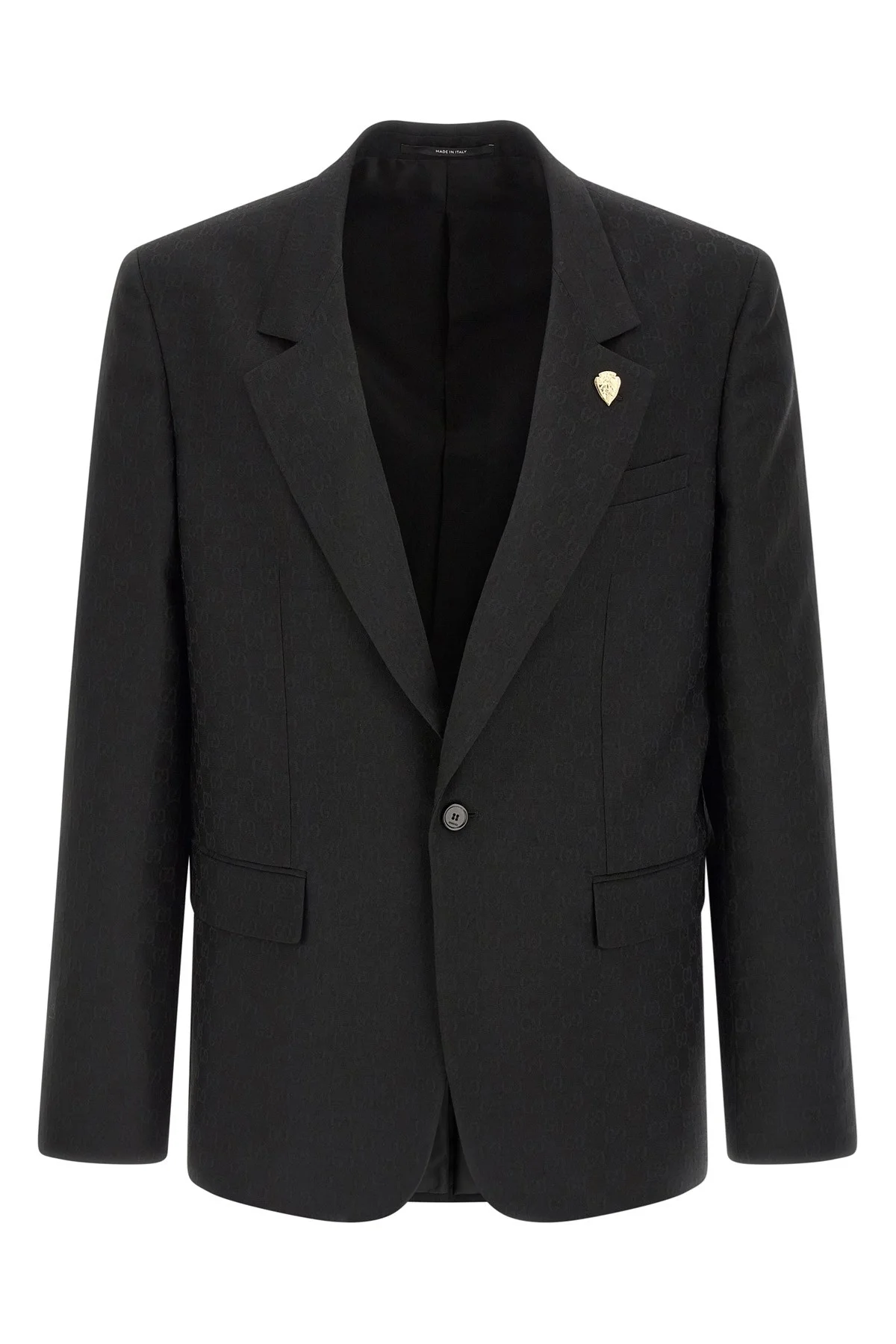 cod. 864110ZAUP11000 Single-breasted 'GG' wool blend canvas blazer with 2 buttons front closure, tooth lapels, satin lining with inner pocket, front pin tucks, front flap pockets, back central split, gold brooch with removable coat of arms, long sleeves with buttons. Color: Black Size & Fit: True to size fit For TG 48 Shoulders 45 cm Length 74 cm Sleeve length 89 cm Composition: 53% polyester 47% wool Made in: Italy