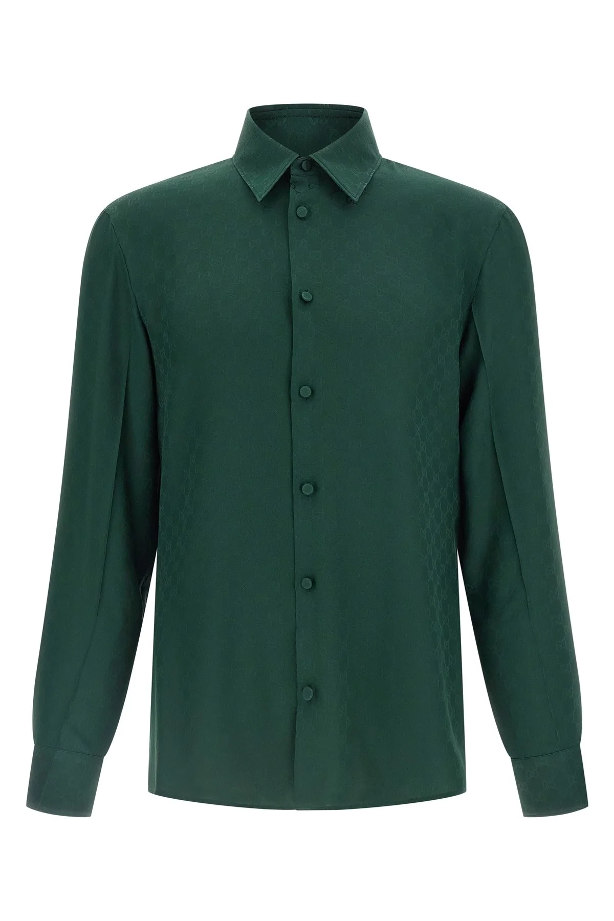 cod. 847034ZATF93514 GG jacquard silk shirt with pointed collar, front button closure, long cuffed sleeves, side slits. Color: Green Size & Fit: Slim fit Composition: 100% silk Made in: Italy