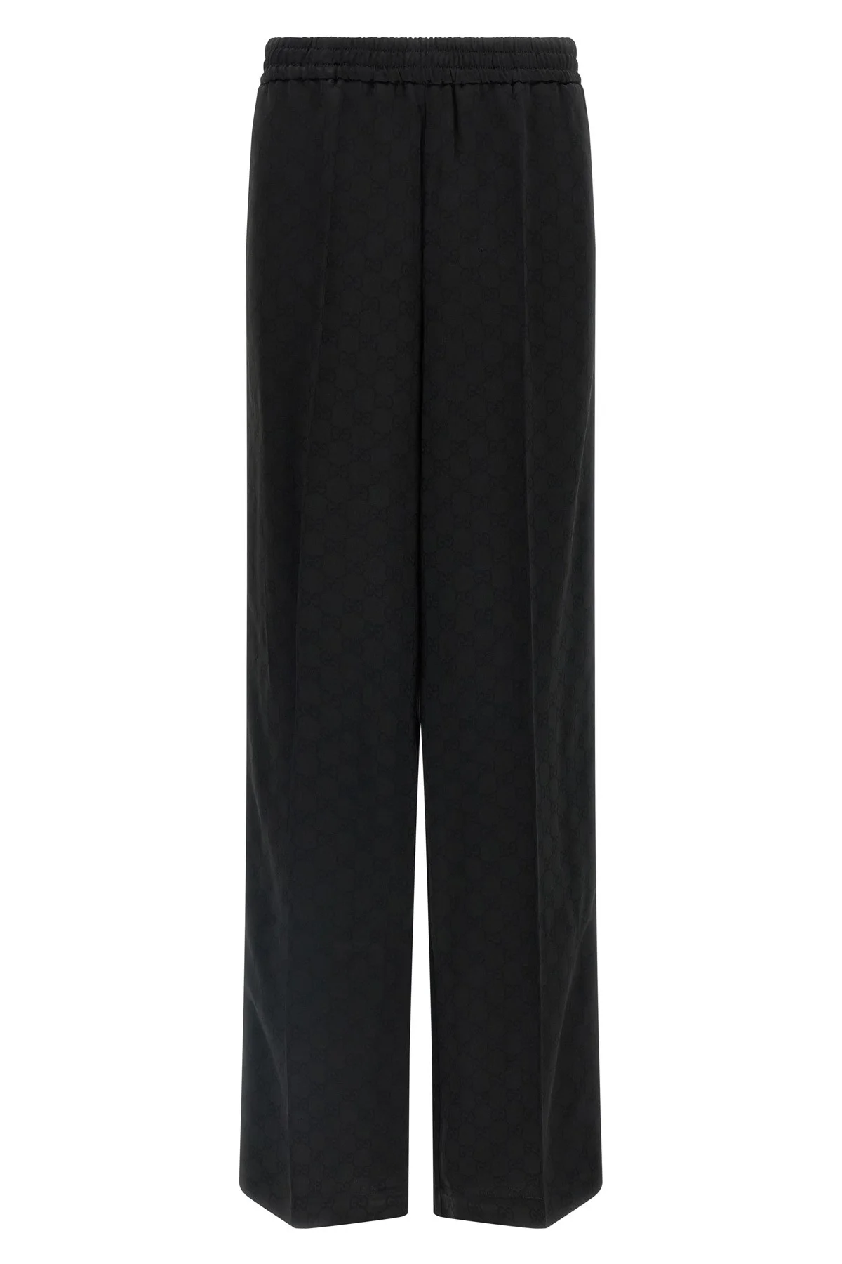 cod. 794774XJGSE1000 All over 'GG' silk jacquard trousers with elastic waistband, side contrast piping, wide and straight leg with front stretched pleat, side pockets. Color: Black Size & Fit: True to size fit Composition: 100% viscose Made in: Italy