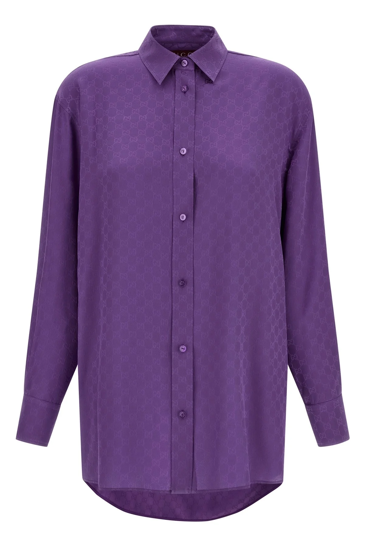 cod. 837168Z7ATQ5007 'GG' jacquard silk shirt with front button closure, long sleeves with cuffs and dropped shoulders, asymmetrical hem. Color: Purple Size & Fit: oversized fit Composition: 100% silk Made in: Italy