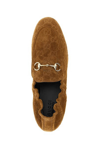 cod. 854414AADWE2118 Suede loafers with embossed GG pattern, front metal clamp, elastic back, leather sole. Color: Brown Size & Fit: EU WOMEN Composition: 100% calfskin leather (Bos Taurus) Made in: Italy