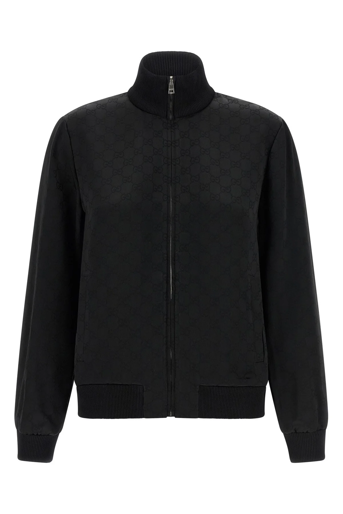 cod. 792383XJGSE1000 Silk-effect viscose satin sweatshirt, all-over GG print, front zip closure, high neck, cuffs, ribbed knit hem, side contrast piping, pockets. Color: Black Composition: 100% viscose Made in: Italy