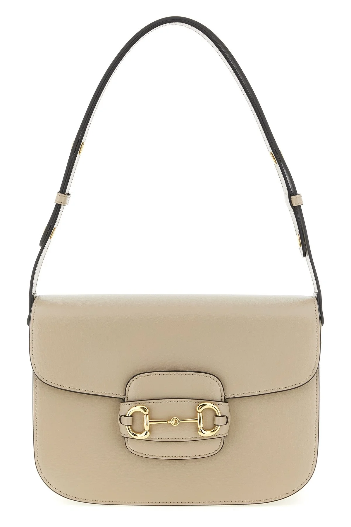 cod. 6022041AAV59511 Medium 'Gucci Horsebit 1955' leather shoulder bag, microfiber lining, interlocking flap closure with front metal 'Morsetto' detail, three-bellows construction, adjustable shoulder strap with half metal 'Morsetto' detail on both sides. Color: Beige Size & Fit: W 25 x H 18 x D 8 cm Composition: 100% calfskin leather (Bos Taurus) Made in: Italy