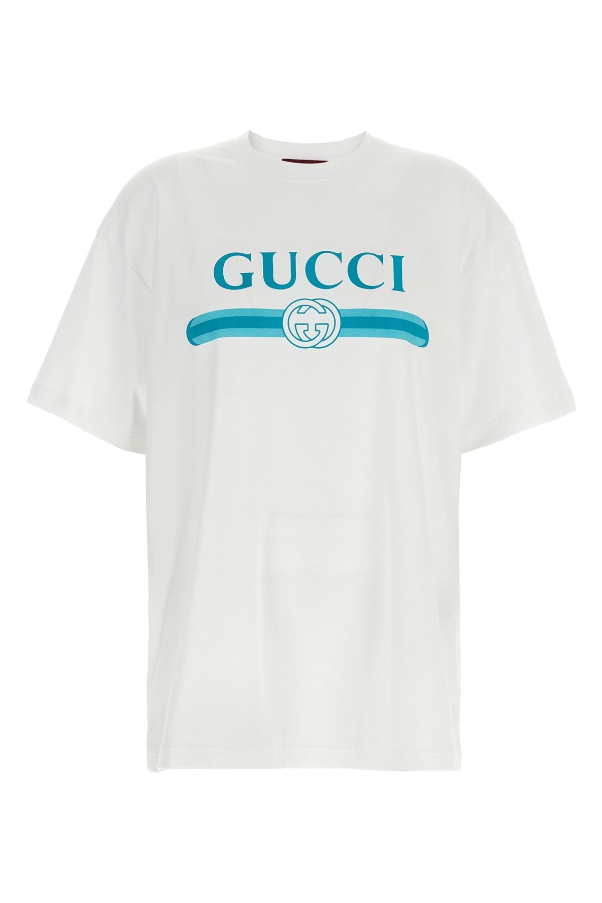 cod. 837959XJHGY9081 Cotton jersey T-shirt with front 'Gucci Incrocio GG e Web' print, crew neck, short sleeves. Color: White Size & Fit: true to size fit Composition: 100% cotton Made in: Italy