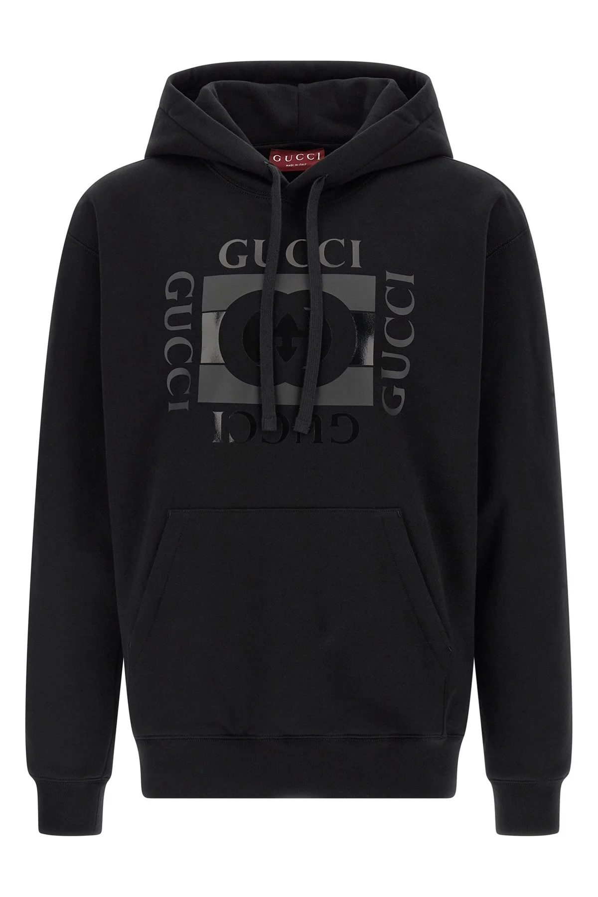 cod. 855976XJHNH1152 Brushed cotton jersey hoodie with tone-on-tone 'Gucci Incrocio GG' print on the front, kangaroo pocket, long sleeves with cuffs and dropped shoulders, and headband. Color: Black Size & Fit: Comfort fit Composition: 100% cotton Made in: Italy