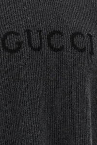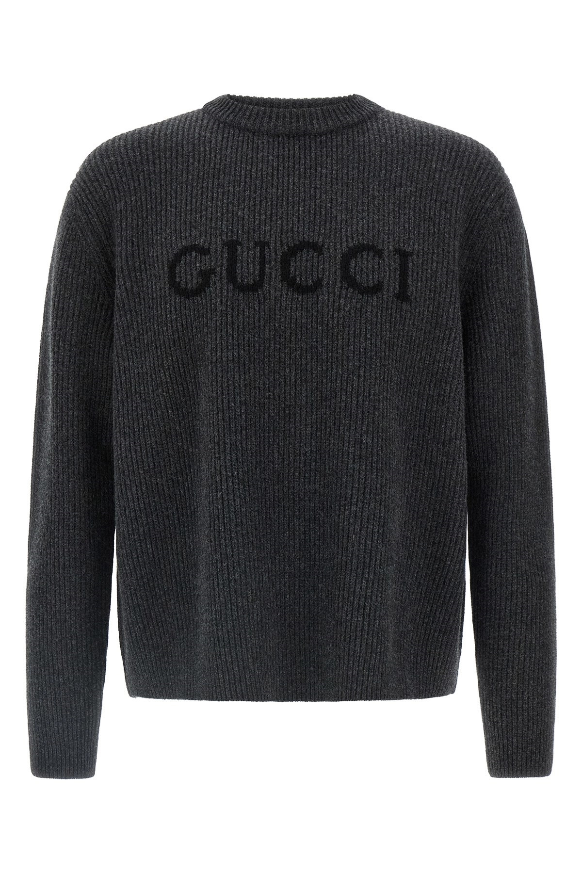 cod. 833499XKEYJ1043 Ribbed wool and cashmere sweater with front Gucci logo intarsia, crew neck, long cuffed sleeves and dropped shoulders. Color: Gray Size & Fit: true to size fit Composition: 70% wool 30% cachemire Made in: Italy PROMO CODE NOT APPLICABLE